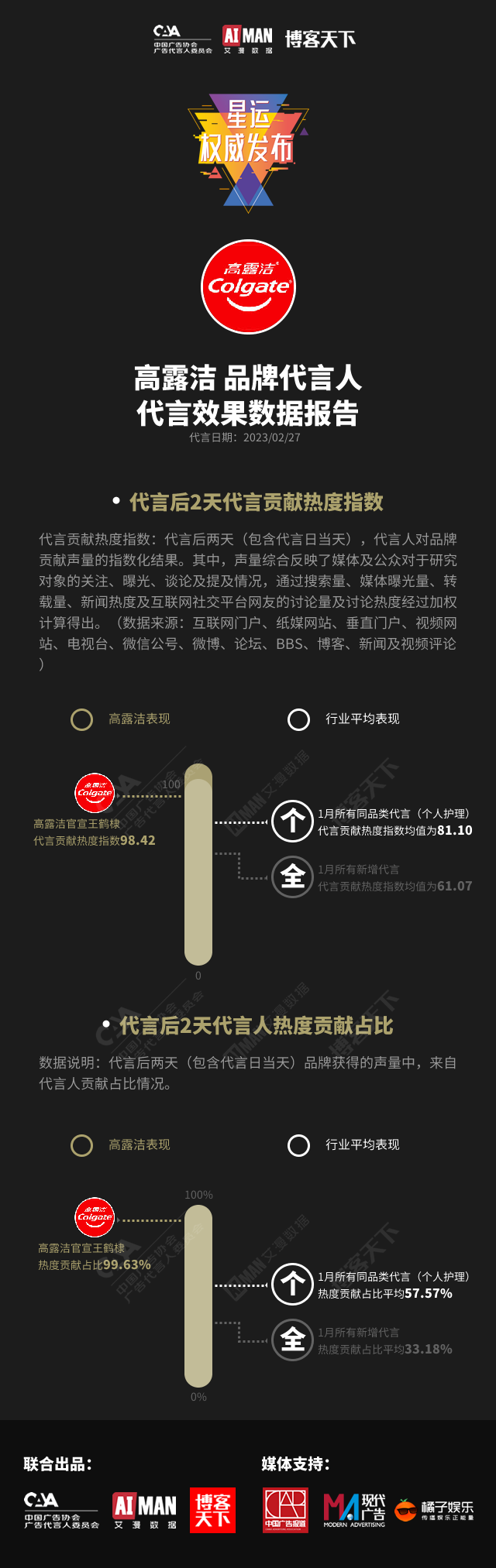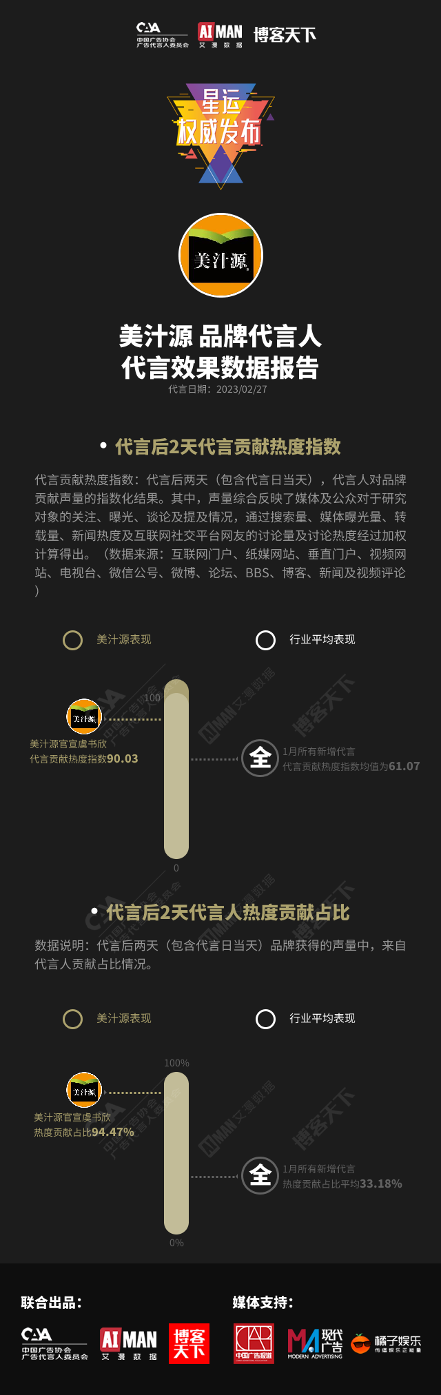 “广告代言人效果数据报告”是由中国广告协会、艾漫数据与《博客天下》联合发布的行业报告。报告将针对国内知名品牌及以上品牌的新增代言进行发布,发布频次分别为日、月。